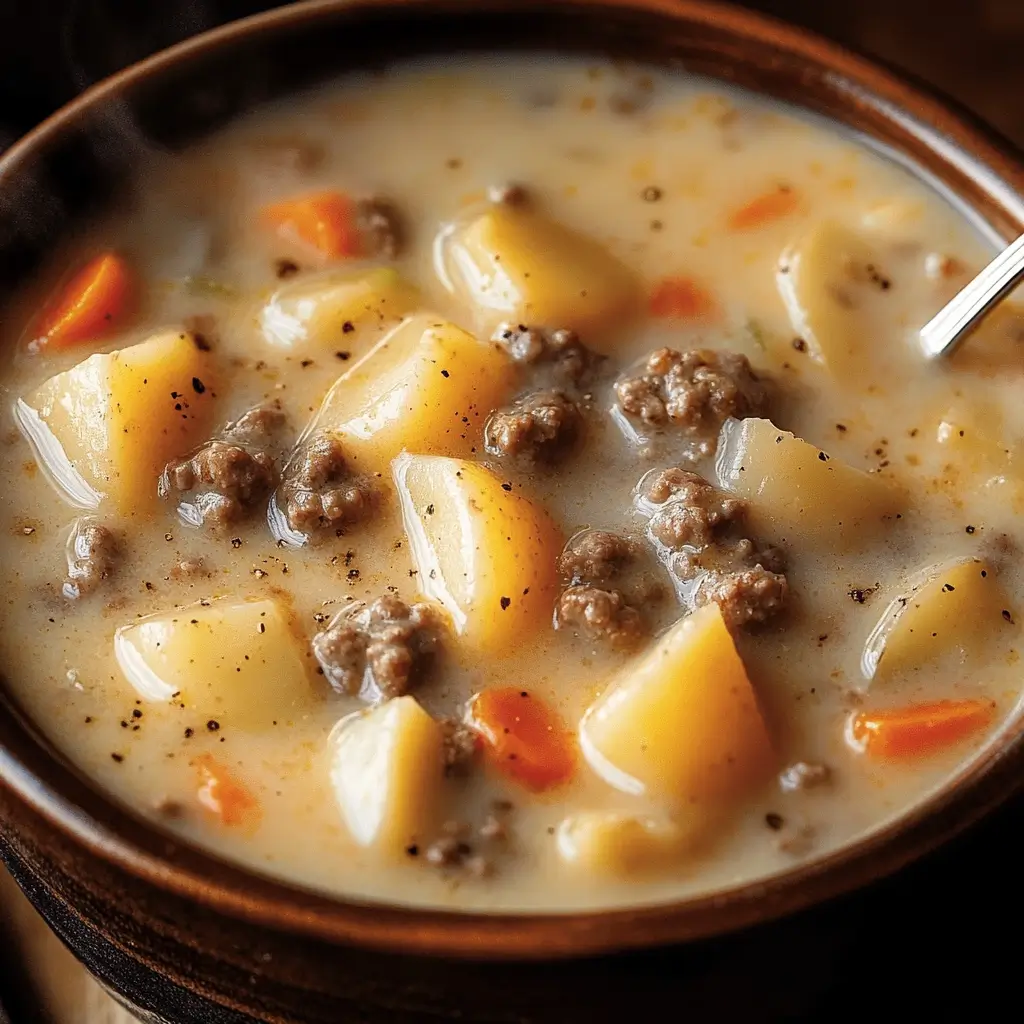 A rich and hearty one-pot soup made with ground beef, potatoes, cheddar cheese, and a creamy broth. Perfect for chilly nights and easy weeknight dinners.